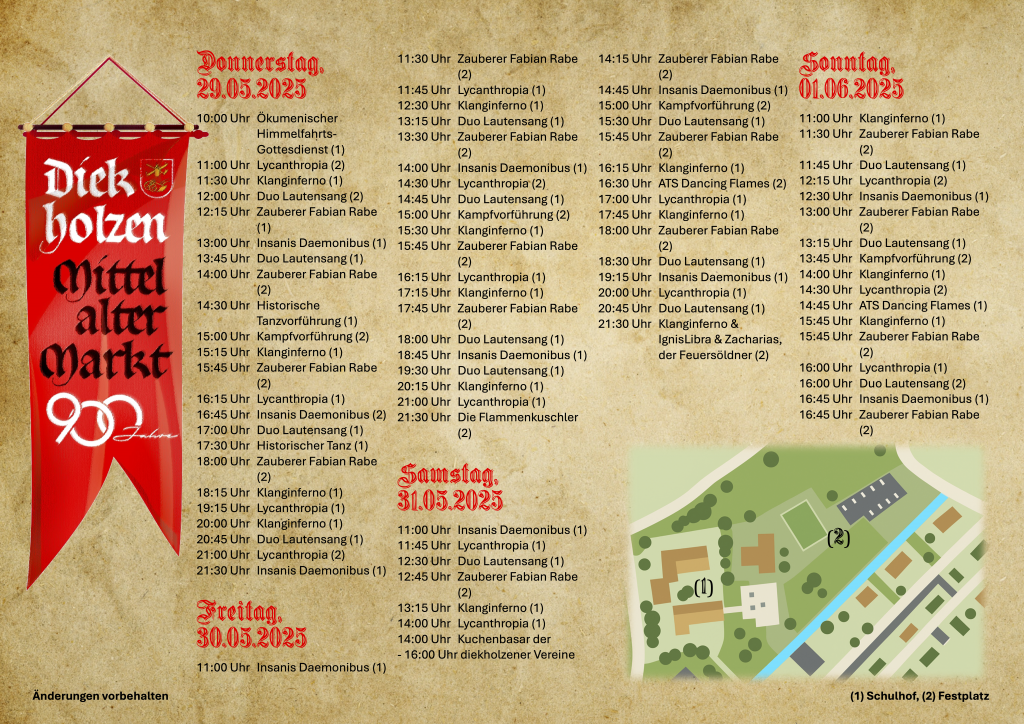 Anlässlich des 900-jährigen Jubiläums lädt die Ortschaft Diekholzen zu einem einzigartigen Mittelaltermarkt ein. Hier verwandelt sich der Schulhof und der Festplatz für ein Wochenende in eine faszinierende Zeitreise ins Mittelalter. Erleben Sie Mittelalterflair und lassen Sie sich von spektakulären Attraktionen begeistern!